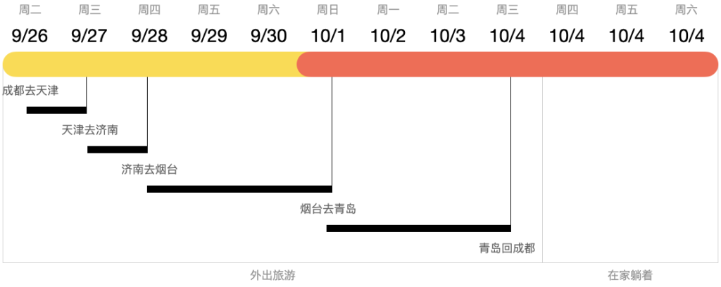 但是回到这次的国庆,到底要怎么安排才能开启一场“紧张,刺激,欢乐,好玩,好吃,有趣,阖家幸福又老少皆宜”的旅途呢?经过各种讨论和分析,我们俩终于在 25 号确定了这几天的行程安排,大概是这样的: